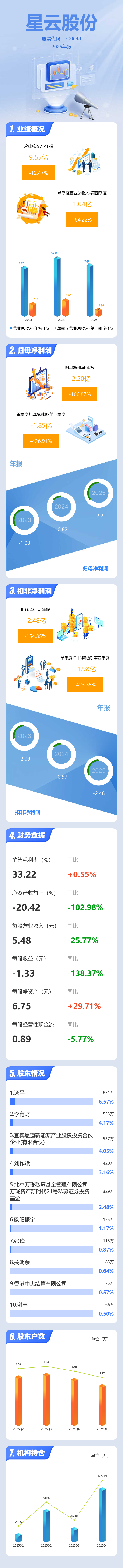 证券之星消息,星云股份2025年年报显示,当年度公司主营收入9.55亿元,同比下降12.47%;归母净利润-2.2亿元,同比下降166.88%;扣非净利润-2.48亿元,同比下降154.36%;其中2025年第四季度,公司单季度主营收入1.04亿元,同比下降64.23%;单季度归母净利润-1.85亿元,同比下降426.92%;单季度扣非净利润-1.98亿元,同比下降423.36%;负债率56.64%,投资收益-1949.03万元,财务费用2202.2万元,毛利率33.22%。