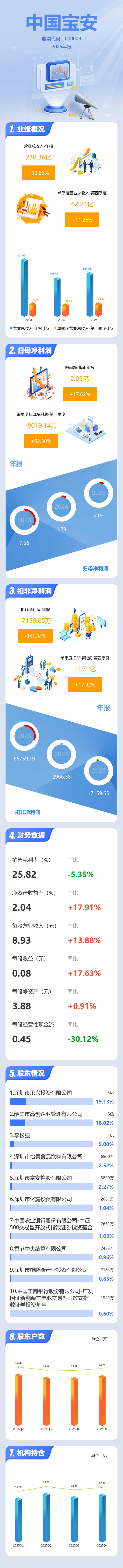 证券之星消息,中国宝安2025年年报显示,当年度公司主营收入230.36亿元,同比上升13.87%;归母净利润2.03亿元,同比上升17.62%;扣非净利润-7159.65万元,同比下降341.34%;其中2025年第四季度,公司单季度主营收入62.24亿元,同比上升11.26%;单季度归母净利润-8019.14万元,同比上升62.31%;单季度扣非净利润-1.71亿元,同比上升17.92%;负债率59.78%,投资收益1.36亿元,财务费用6.7亿元,毛利率25.82%。