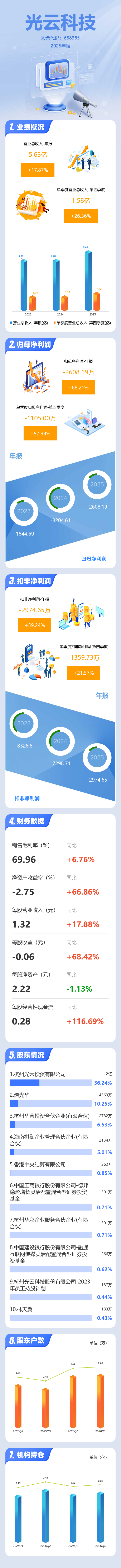 证券之星消息,光云科技2025年年报显示,当年度公司主营收入5.63亿元,同比上升17.88%;归母净利润-2608.19万元,同比上升68.21%;扣非净利润-2974.65万元,同比上升59.24%;其中2025年第四季度,公司单季度主营收入1.58亿元,同比上升26.36%;单季度归母净利润-1105.0万元,同比上升57.99%;单季度扣非净利润-1359.73万元,同比上升21.57%;负债率46.1%,投资收益710.89万元,财务费用488.0万元,毛利率69.96%。