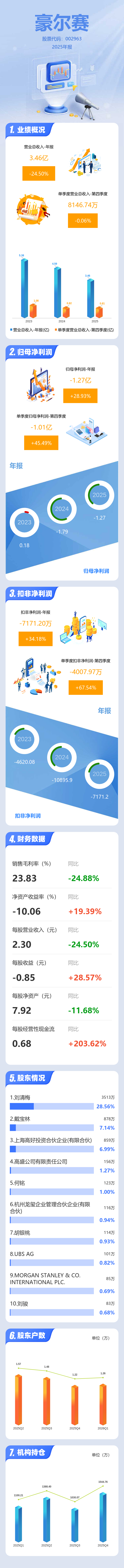 证券之星消息,豪尔赛2025年年报显示,当年度公司主营收入3.46亿元,同比下降24.51%;归母净利润-1.27亿元,同比上升28.94%;扣非净利润-7171.2万元,同比上升34.18%;其中2025年第四季度,公司单季度主营收入8146.74万元,同比下降0.06%;单季度归母净利润-1.01亿元,同比上升45.49%;单季度扣非净利润-4007.97万元,同比上升67.54%;负债率26.46%,投资收益299.14万元,财务费用95.46万元,毛利率23.83%。