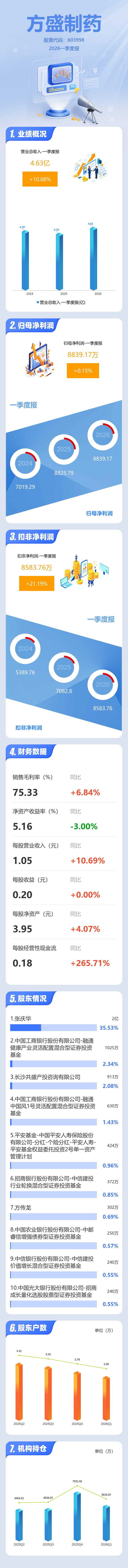 证券之星消息,方盛制药2026年一季报显示,一季度公司主营收入4.63亿元,同比上升10.69%;归母净利润8839.17万元,同比上升0.15%;扣非净利润8583.76万元,同比上升21.19%;负债率39.93%,投资收益41.53万元,财务费用189.36万元,毛利率75.33%。