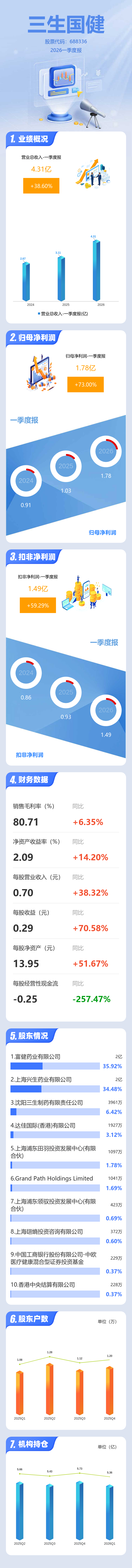 证券之星消息,三生国健2026年一季报显示,一季度公司主营收入4.31亿元,同比上升38.61%;归母净利润1.78亿元,同比上升73.0%;扣非净利润1.49亿元,同比上升59.29%;负债率4.11%,投资收益283.96万元,财务费用1514.65万元,毛利率80.71%。