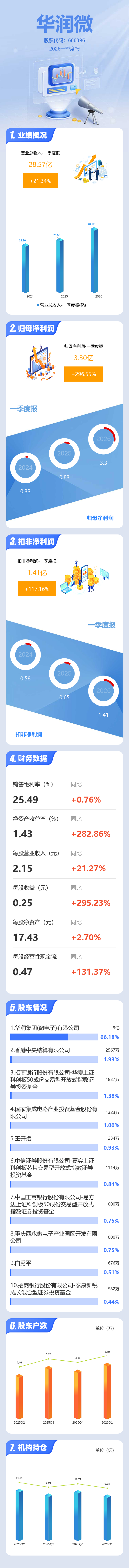 证券之星消息,华润微2026年一季报显示,一季度公司主营收入28.57亿元,同比上升21.34%;归母净利润3.3亿元,同比上升296.56%;扣非净利润1.41亿元,同比上升117.16%;负债率17.87%,投资收益-1.04亿元,财务费用-1000.48万元,毛利率25.48%。
