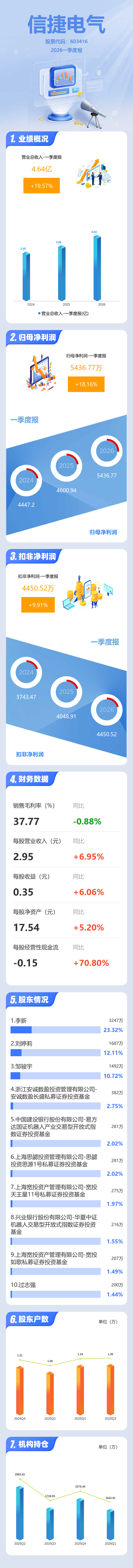 证券之星消息,信捷电气2026年一季报显示,一季度公司主营收入4.64亿元,同比上升19.57%;归母净利润5436.77万元,同比上升18.17%;扣非净利润4450.52万元,同比上升9.92%;负债率25.41%,投资收益181.47万元,财务费用23.38万元,毛利率37.77%。