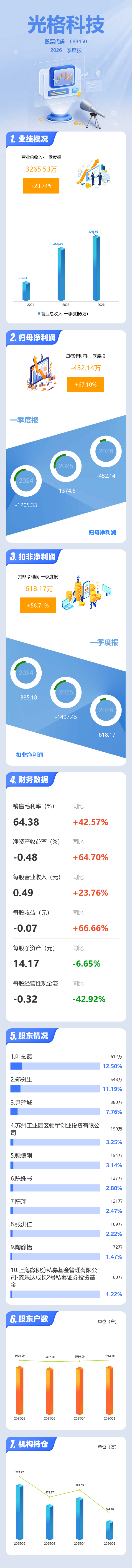 证券之星消息,光格科技2026年一季报显示,一季度公司主营收入3265.53万元,同比上升23.74%;归母净利润-452.14万元,同比上升67.11%;扣非净利润-618.17万元,同比上升58.72%;负债率21.32%,投资收益131.52万元,财务费用19.88万元,毛利率64.38%。