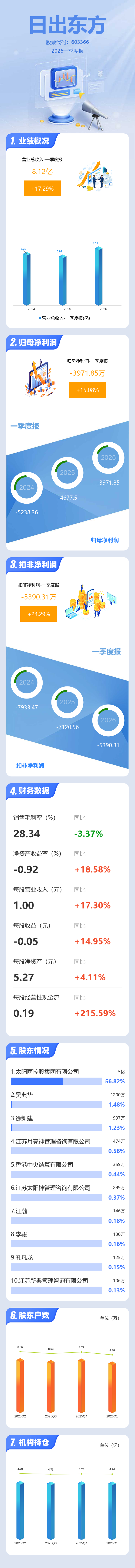 证券之星消息,日出东方2026年一季报显示,一季度公司主营收入8.12亿元,同比上升17.29%;归母净利润-3971.85万元,同比上升15.09%;扣非净利润-5390.31万元,同比上升24.3%;负债率47.55%,投资收益282.01万元,财务费用1012.19万元,毛利率28.34%。