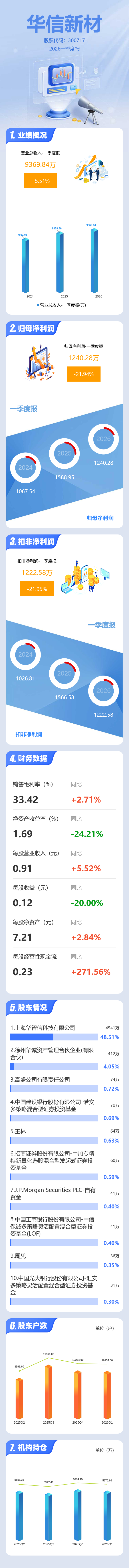 证券之星消息,华信新材2026年一季报显示,一季度公司主营收入9369.84万元,同比上升5.52%;归母净利润1240.28万元,同比下降21.94%;扣非净利润1222.58万元,同比下降21.96%;负债率27.49%,投资收益4.24万元,财务费用299.47万元,毛利率33.42%。