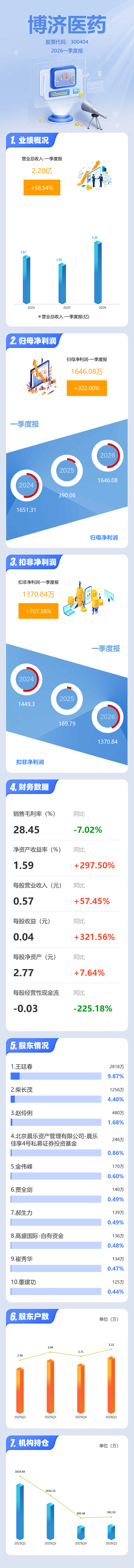 证券之星消息,博济医药2026年一季报显示,一季度公司主营收入2.2亿元,同比上升58.54%;归母净利润1646.08万元,同比上升322.01%;扣非净利润1370.84万元,同比上升707.37%;负债率34.06%,投资收益44.32万元,财务费用21.63万元,毛利率28.45%。
