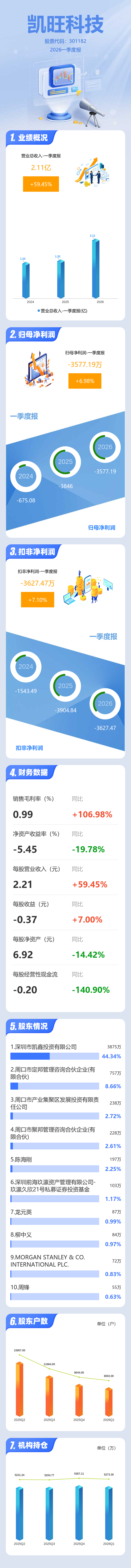 证券之星消息,凯旺科技2026年一季报显示,一季度公司主营收入2.11亿元,同比上升59.45%;归母净利润-3577.19万元,同比上升6.99%;扣非净利润-3627.47万元,同比上升7.1%;负债率61.23%,投资收益-33.18万元,财务费用351.5万元,毛利率0.99%。