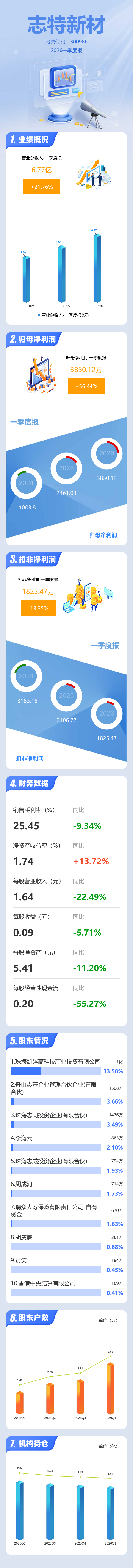 证券之星消息,志特新材2026年一季报显示,一季度公司主营收入6.77亿元,同比上升21.77%;归母净利润3850.12万元,同比上升56.44%;扣非净利润1825.47万元,同比下降13.35%;负债率63.25%,投资收益-70.94万元,财务费用2651.91万元,毛利率25.45%。