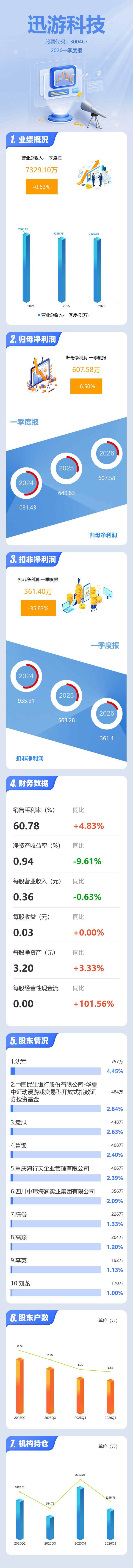 证券之星消息,迅游科技2026年一季报显示,一季度公司主营收入7329.1万元,同比下降0.63%;归母净利润607.58万元,同比下降6.5%;扣非净利润361.4万元,同比下降35.84%;负债率19.46%,投资收益276.11万元,财务费用-99.12万元,毛利率60.78%。