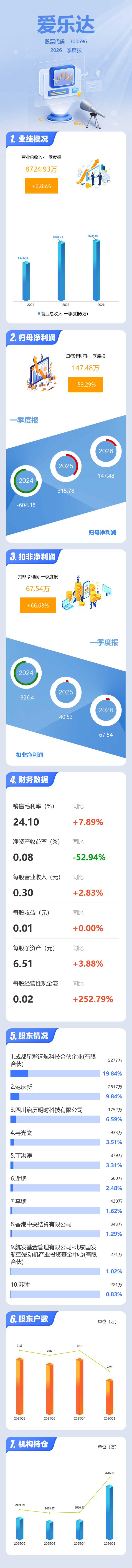 证券之星消息,爱乐达2026年一季报显示,一季度公司主营收入8724.93万元,同比上升2.86%;归母净利润147.48万元,同比下降53.3%;扣非净利润67.54万元,同比上升66.63%;负债率9.95%,投资收益-175.17万元,财务费用-87.36万元,毛利率24.1%。