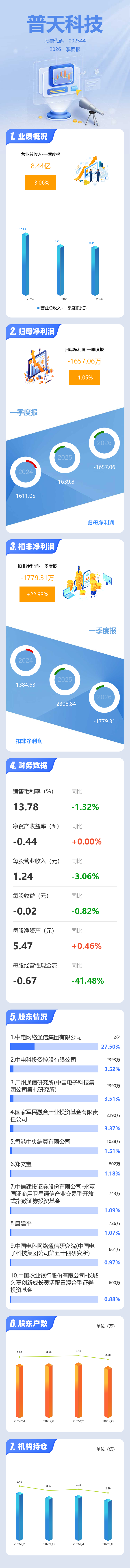 证券之星消息,普天科技2026年一季报显示,一季度公司主营收入8.44亿元,同比下降3.07%;归母净利润-1657.06万元,同比下降1.05%;扣非净利润-1779.31万元,同比上升22.93%;负债率55.85%,投资收益0.0万元,财务费用205.08万元,毛利率13.78%。