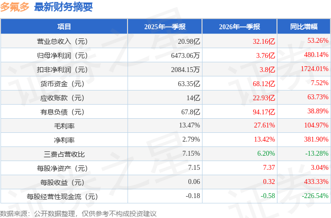 据证券之星公开数据整理,近期多氟多(002407)发布2026年一季报。截至本报告期末,公司营业总收入32.16亿元,同比上升53.26%,归母净利润3.76亿元,同比上升480.14%。按单季度数据看,第一季度营业总收入32.16亿元,同比上升53.26%,第一季度归母净利润3.76亿元,同比上升480.14%。本报告期多氟多应收账款上升,应收账款同比增幅达63.73%。