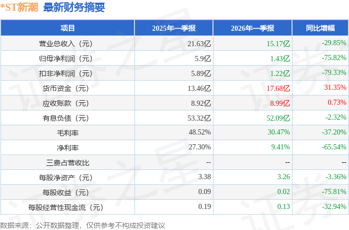 据证券之星公开数据整理,近期*ST新潮(600777)发布2026年一季报。截至本报告期末,公司营业总收入15.17亿元,同比下降29.85%,归母净利润1.43亿元,同比下降75.82%。按单季度数据看,第一季度营业总收入15.17亿元,同比下降29.85%,第一季度归母净利润1.43亿元,同比下降75.82%。本报告期*ST新潮公司应收账款体量较大,当期应收账款占最新年报归母净利润比达74.43%。