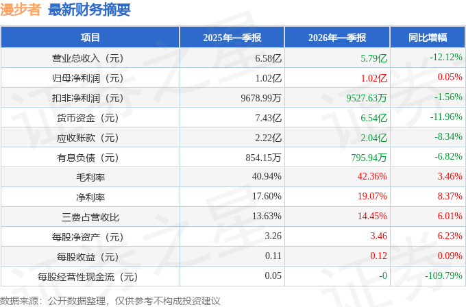 据证券之星公开数据整理,近期漫步者(002351)发布2026年一季报。截至本报告期末,公司营业总收入5.79亿元,同比下降12.12%,归母净利润1.02亿元,同比上升0.05%。按单季度数据看,第一季度营业总收入5.79亿元,同比下降12.12%,第一季度归母净利润1.02亿元,同比上升0.05%。本报告期漫步者盈利能力上升,毛利率同比增幅3.46%,净利率同比增幅8.37%。