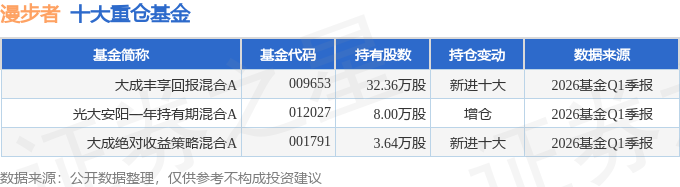 持有漫步者最多的基金为大成丰享回报混合A,目前规模为3.97亿元,最新净值1.1924(4月24日),较上一交易日上涨0.02%,近一年上涨6.5%。该基金现任基金经理为苏秉毅 郑煌斌。