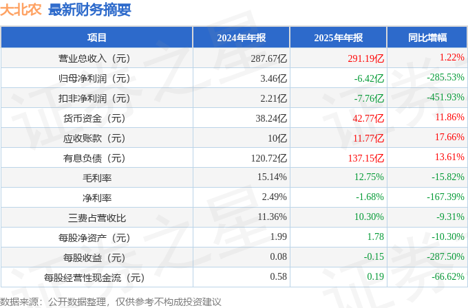 据证券之星公开数据整理,近期大北农(002385)发布2025年年报。截至本报告期末,公司营业总收入291.19亿元,同比上升1.22%,归母净利润-6.42亿元,同比下降285.53%。按单季度数据看,第四季度营业总收入83.75亿元,同比下降2.89%,第四季度归母净利润-8.99亿元,同比下降523.22%。本报告期大北农短期债务压力上升,流动比率达0.75。
