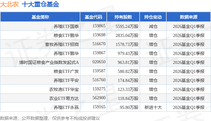 持有大北农最多的基金为养殖ETF国泰,目前规模为47.41亿元,最新净值0.6068(4月23日),较上一交易日下跌1.57%,近一年上涨3.41%。该基金现任基金经理为梁杏。