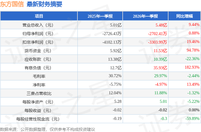 据证券之星公开数据整理,近期东方国信(300166)发布2026年一季报。根据财报显示,东方国信营收上升亏损收窄。截至本报告期末,公司营业总收入5.48亿元,同比上升9.44%,归母净利润-2702.41万元,同比上升0.88%。按单季度数据看,第一季度营业总收入5.48亿元,同比上升9.44%,第一季度归母净利润-2702.41万元,同比上升0.88%。