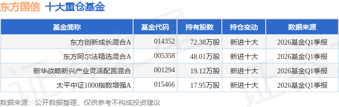 持有东方国信最多的基金为东方创新成长混合A,目前规模为0.4亿元,最新净值1.484(4月24日),较上一交易日下跌0.75%,近一年上涨49.63%。该基金现任基金经理为吴昊。