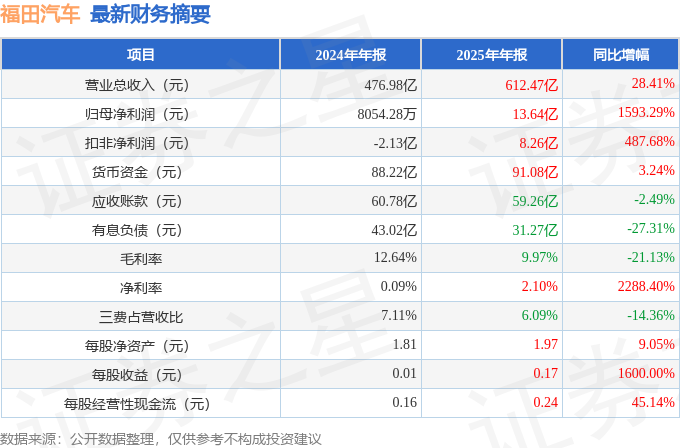 据证券之星公开数据整理,近期福田汽车(600166)发布2025年年报。截至本报告期末,公司营业总收入612.47亿元,同比上升28.41%,归母净利润13.64亿元,同比上升1593.29%。按单季度数据看,第四季度营业总收入157.98亿元,同比上升32.36%,第四季度归母净利润2.51亿元,同比上升171.43%。本报告期福田汽车公司应收账款体量较大,当期应收账款占最新年报归母净利润比达434.54%。