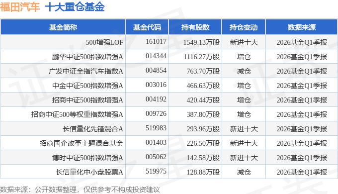 持有福田汽车最多的基金为500增强LOF,目前规模为39.47亿元,最新净值2.732(4月24日),较上一交易日下跌0.51%,近一年上涨43.64%。该基金现任基金经理为李笑薇 方旻 汤杰强。