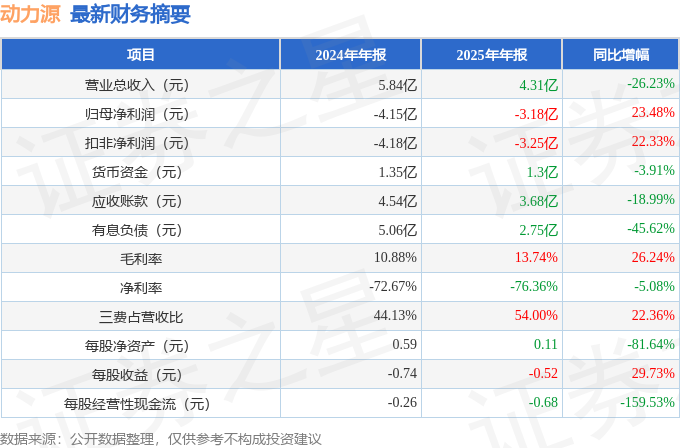 据证券之星公开数据整理,近期动力源(600405)发布2025年年报。截至本报告期末,公司营业总收入4.31亿元,同比下降26.23%,归母净利润-3.18亿元,同比上升23.48%。按单季度数据看,第四季度营业总收入1.35亿元,同比上升2.52%,第四季度归母净利润-1.62亿元,同比上升37.15%。本报告期动力源公司应收账款体量较大,当期应收账款占最新年报营业总收入比达85.39%。