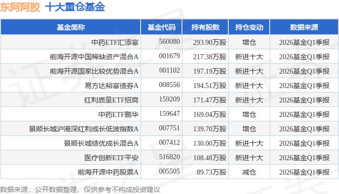 持有东阿阿胶最多的基金为中药ETF汇添富,目前规模为25.1亿元,最新净值0.992(4月24日),较上一交易日上涨0.02%,近一年下跌4.59%。该基金现任基金经理为过蓓蓓。