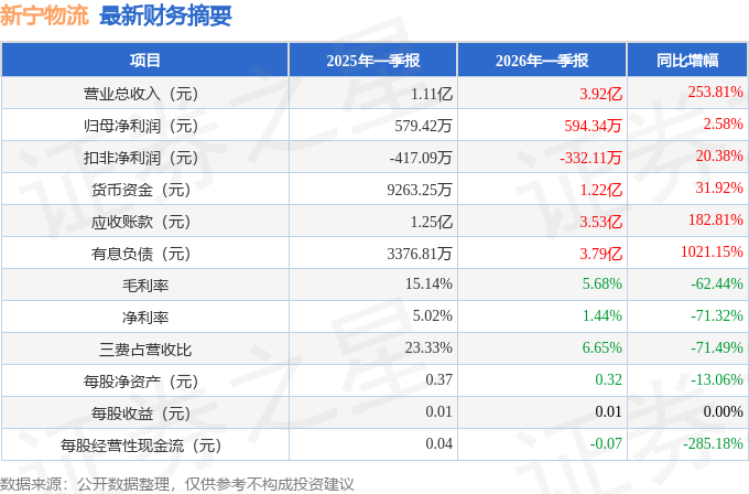 据证券之星公开数据整理,近期新宁物流(300013)发布2026年一季报。截至本报告期末,公司营业总收入3.92亿元,同比上升253.81%,归母净利润594.34万元,同比上升2.58%。按单季度数据看,第一季度营业总收入3.92亿元,同比上升253.81%,第一季度归母净利润594.34万元,同比上升2.58%。本报告期新宁物流公司应收账款体量较大,当期应收账款占最新年报营业总收入比达48.72%。