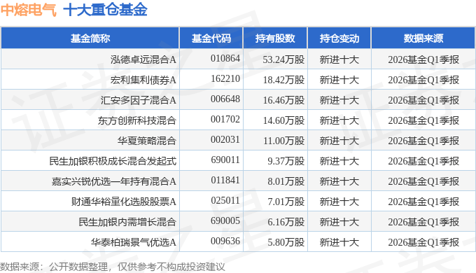 持有中熔电气最多的基金为泓德卓远混合A,目前规模为18.96亿元,最新净值0.8047(4月24日),较上一交易日下跌0.48%,近一年上涨47.43%。该基金现任基金经理为于浩成。