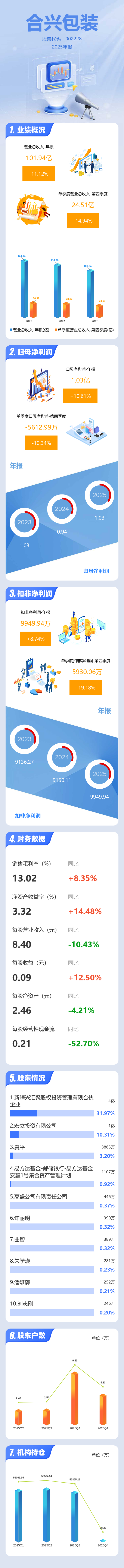 证券之星消息,合兴包装2025年年报显示,当年度公司主营收入101.94亿元,同比下降11.13%;归母净利润1.03亿元,同比上升10.61%;扣非净利润9949.94万元,同比上升8.74%;其中2025年第四季度,公司单季度主营收入24.51亿元,同比下降14.95%;单季度归母净利润-5612.99万元,同比下降10.35%;单季度扣非净利润-5930.06万元,同比下降19.18%;负债率58.41%,投资收益167.63万元,财务费用4153.0万元,毛利率13.02%。