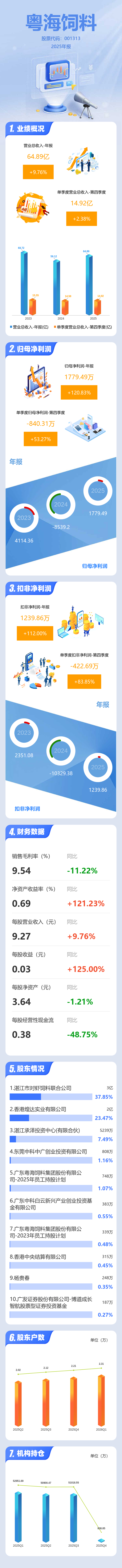 证券之星消息,粤海饲料2025年年报显示,当年度公司主营收入64.89亿元,同比上升9.77%;归母净利润1779.49万元,同比上升120.84%;扣非净利润1239.86万元,同比上升112.0%;其中2025年第四季度,公司单季度主营收入14.92亿元,同比上升2.39%;单季度归母净利润-840.31万元,同比上升53.27%;单季度扣非净利润-422.69万元,同比上升83.85%;负债率46.57%,投资收益-867.32万元,财务费用3086.81万元,毛利率9.54%。