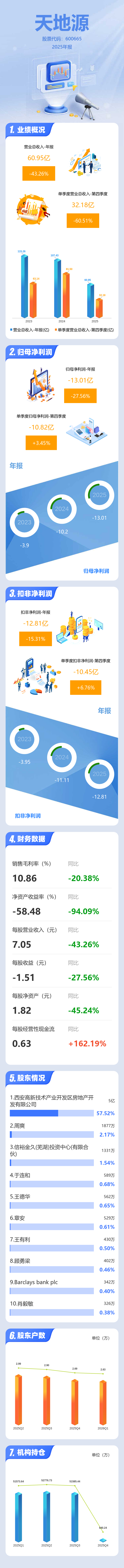 证券之星消息,天地源2025年年报显示,当年度公司主营收入60.95亿元,同比下降43.26%;归母净利润-13.01亿元,同比下降27.56%;扣非净利润-12.81亿元,同比下降15.32%;其中2025年第四季度,公司单季度主营收入32.18亿元,同比下降60.51%;单季度归母净利润-10.82亿元,同比上升3.46%;单季度扣非净利润-10.45亿元,同比上升6.76%;负债率89.57%,投资收益-3442.15万元,财务费用3.9亿元,毛利率10.86%。