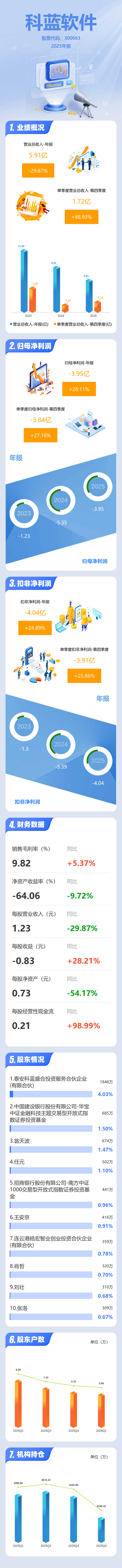 证券之星消息,科蓝软件2025年年报显示,当年度公司主营收入5.91亿元,同比下降29.88%;归母净利润-3.95亿元,同比上升26.12%;扣非净利润-4.04亿元,同比上升24.89%;其中2025年第四季度,公司单季度主营收入1.72亿元,同比上升48.93%;单季度归母净利润-3.84亿元,同比上升27.16%;单季度扣非净利润-3.91亿元,同比上升25.86%;负债率76.87%,投资收益2.23万元,财务费用3527.41万元,毛利率9.82%。