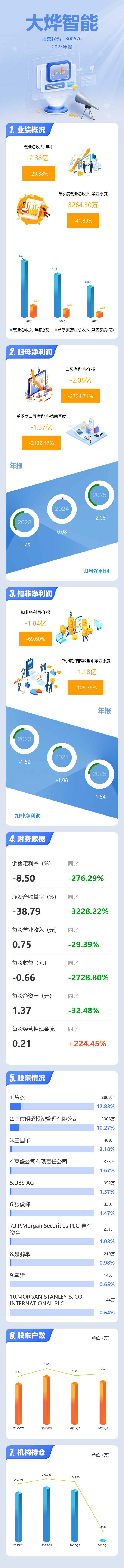 证券之星消息,大烨智能2025年年报显示,当年度公司主营收入2.38亿元,同比下降29.39%;归母净利润-2.08亿元,同比下降2724.72%;扣非净利润-1.84亿元,同比下降69.6%;其中2025年第四季度,公司单季度主营收入3264.3万元,同比下降41.9%;单季度归母净利润-1.37亿元,同比下降2132.48%;单季度扣非净利润-1.18亿元,同比下降106.77%;负债率73.6%,投资收益-299.44万元,财务费用3343.43万元,毛利率-8.5%。
