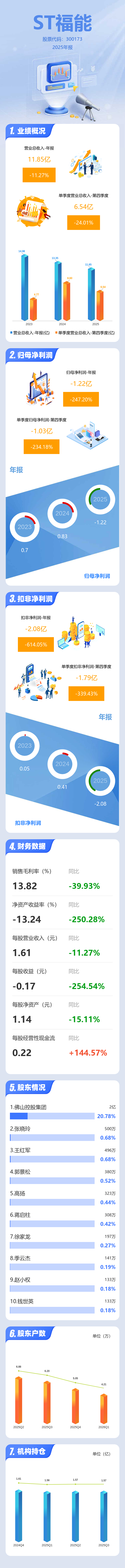 证券之星消息,ST福能2025年年报显示,当年度公司主营收入11.85亿元,同比下降11.28%;归母净利润-1.22亿元,同比下降247.2%;扣非净利润-2.08亿元,同比下降614.05%;其中2025年第四季度,公司单季度主营收入6.54亿元,同比下降24.02%;单季度归母净利润-1.03亿元,同比下降234.19%;单季度扣非净利润-1.79亿元,同比下降339.43%;负债率74.46%,投资收益8140.8万元,财务费用2740.38万元,毛利率13.82%。