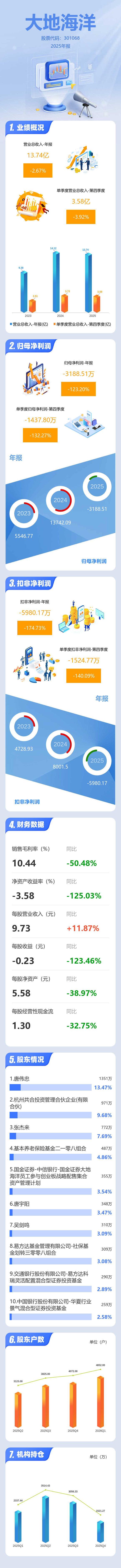 证券之星消息,大地海洋2025年年报显示,当年度公司主营收入13.74亿元,同比下降2.67%;归母净利润-3188.51万元,同比下降123.2%;扣非净利润-5980.17万元,同比下降174.74%;其中2025年第四季度,公司单季度主营收入3.58亿元,同比下降3.93%;单季度归母净利润-1437.8万元,同比下降132.27%;单季度扣非净利润-1524.77万元,同比下降140.1%;负债率53.57%,财务费用1151.62万元,毛利率10.44%。