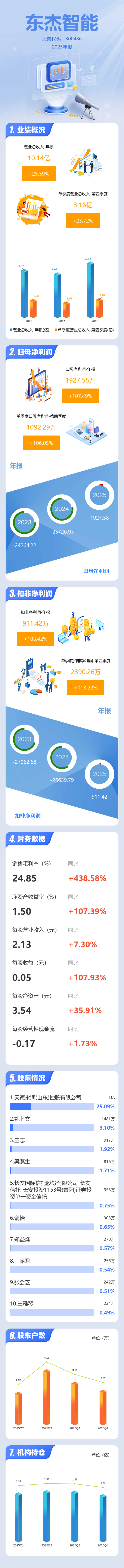 证券之星消息,东杰智能2025年年报显示,当年度公司主营收入10.14亿元,同比上升25.59%;归母净利润1927.58万元,同比上升107.49%;扣非净利润911.42万元,同比上升103.42%;其中2025年第四季度,公司单季度主营收入3.16亿元,同比上升23.72%;单季度归母净利润1092.29万元,同比上升106.06%;单季度扣非净利润2390.26万元,同比上升113.22%;负债率43.81%,投资收益-485.29万元,财务费用2153.55万元,毛利率24.85%。