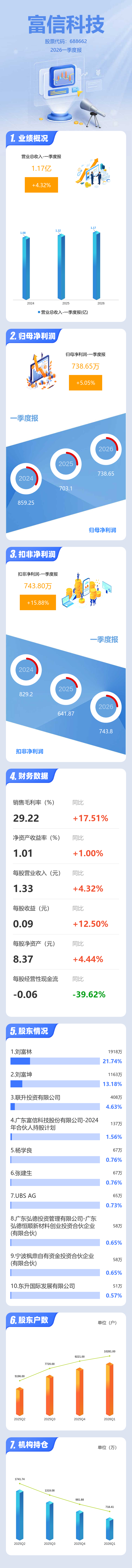证券之星消息,富信科技2026年一季报显示,一季度公司主营收入1.17亿元,同比上升4.33%;归母净利润738.65万元,同比上升5.06%;扣非净利润743.8万元,同比上升15.88%;负债率23.62%,投资收益-3.35万元,财务费用211.03万元,毛利率29.22%。