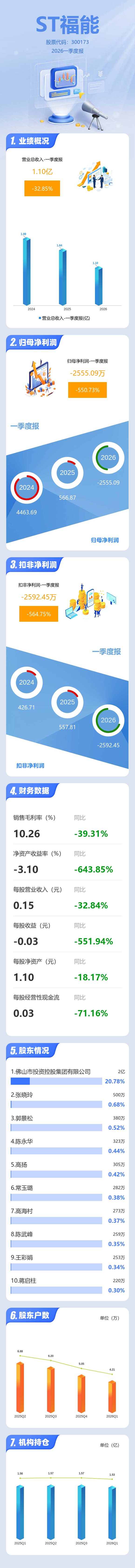 证券之星消息,ST福能2026年一季报显示,一季度公司主营收入1.1亿元,同比下降32.86%;归母净利润-2555.09万元,同比下降550.73%;扣非净利润-2592.45万元,同比下降564.76%;负债率76.81%,投资收益181.67万元,财务费用439.91万元,毛利率10.26%。
