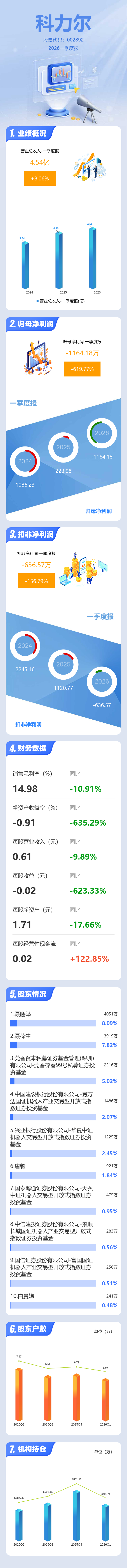证券之星消息,科力尔2026年一季报显示,一季度公司主营收入4.54亿元,同比上升8.07%;归母净利润-1164.18万元,同比下降619.78%;扣非净利润-636.57万元,同比下降156.8%;负债率51.33%,投资收益139.25万元,财务费用904.24万元,毛利率14.98%。