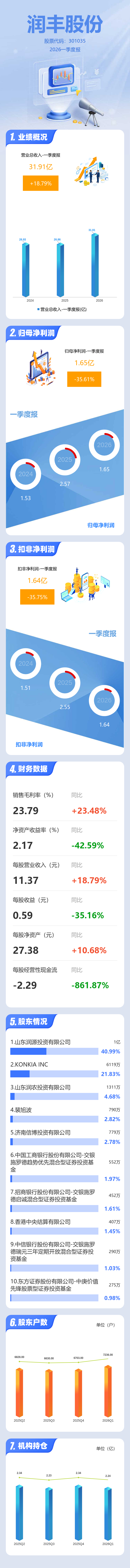证券之星消息,润丰股份2026年一季报显示,一季度公司主营收入31.91亿元,同比上升18.8%;归母净利润1.65亿元,同比下降35.61%;扣非净利润1.64亿元,同比下降35.75%;负债率53.82%,投资收益-1678.68万元,财务费用7446.14万元,毛利率23.79%。