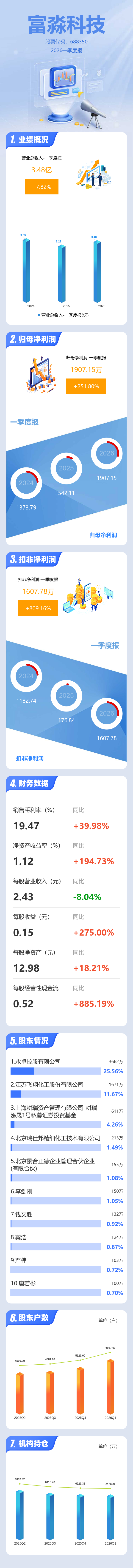 证券之星消息,富淼科技2026年一季报显示,一季度公司主营收入3.48亿元,同比上升7.83%;归母净利润1907.15万元,同比上升251.8%;扣非净利润1607.78万元,同比上升809.17%;负债率34.84%,投资收益77.67万元,财务费用396.45万元,毛利率19.47%。