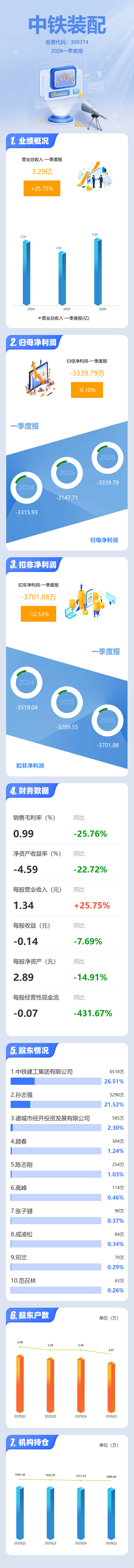 证券之星消息,中铁装配2026年一季报显示,一季度公司主营收入3.29亿元,同比上升25.75%;归母净利润-3339.79万元,同比下降6.1%;扣非净利润-3701.88万元,同比下降12.53%;负债率83.32%,财务费用818.34万元,毛利率0.99%。