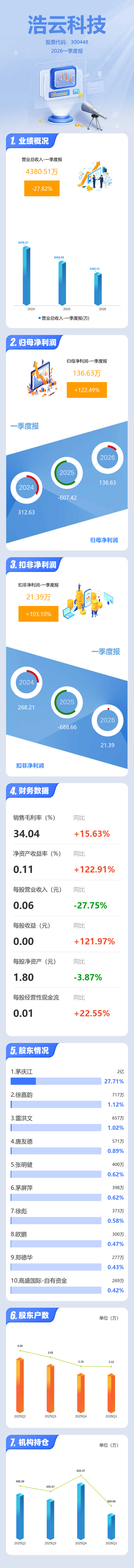 证券之星消息,浩云科技2026年一季报显示,一季度公司主营收入4380.51万元,同比下降27.83%;归母净利润136.63万元,同比上升122.49%;扣非净利润21.39万元,同比上升103.11%;负债率4.84%,投资收益41.61万元,财务费用-696.75万元,毛利率34.04%。