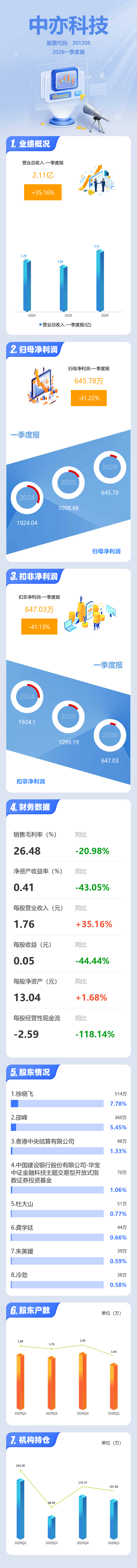 证券之星消息,中亦科技2026年一季报显示,一季度公司主营收入2.11亿元,同比上升35.16%;归母净利润645.78万元,同比下降41.22%;扣非净利润647.03万元,同比下降41.14%;负债率20.4%,财务费用-228.01万元,毛利率26.48%。