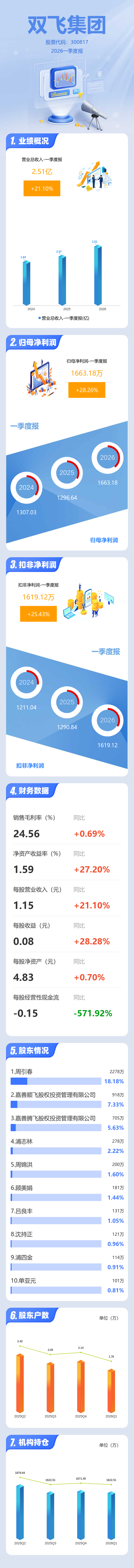 证券之星消息,双飞集团2026年一季报显示,一季度公司主营收入2.51亿元,同比上升21.11%;归母净利润1663.18万元,同比上升28.27%;扣非净利润1619.12万元,同比上升25.43%;负债率19.38%,投资收益-6.35万元,财务费用203.85万元,毛利率24.56%。