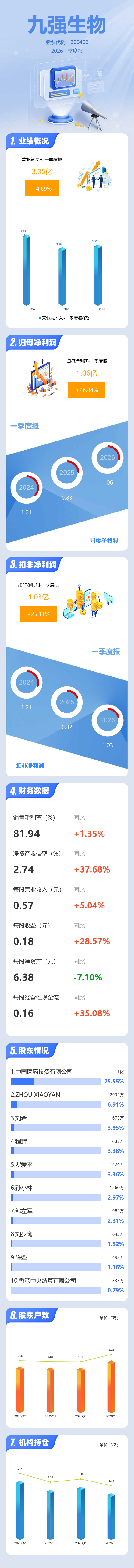 证券之星消息,九强生物2026年一季报显示,一季度公司主营收入3.35亿元,同比上升4.69%;归母净利润1.06亿元,同比上升26.84%;扣非净利润1.03亿元,同比上升25.12%;负债率25.04%,投资收益366.52万元,财务费用1092.86万元,毛利率81.94%。