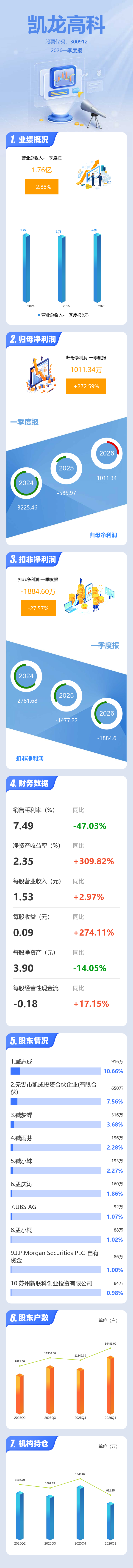 证券之星消息,凯龙高科2026年一季报显示,一季度公司主营收入1.76亿元,同比上升2.88%;归母净利润1011.34万元,同比上升272.59%;扣非净利润-1884.6万元,同比下降27.58%;负债率65.83%,投资收益11.52万元,财务费用317.95万元,毛利率7.49%。